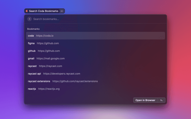 Quickly find and open your bookmarked URLs stored in a coda table.