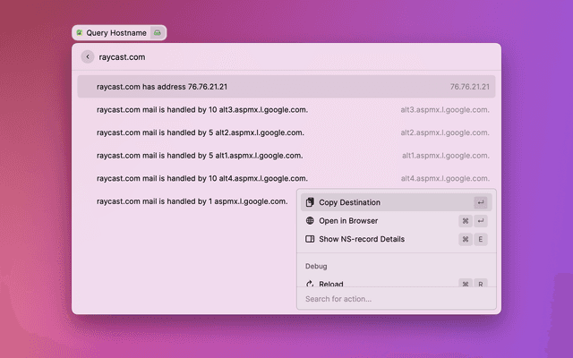DNS lookup and nameserver query using the built-in host command on macOS. Built for Raycast.