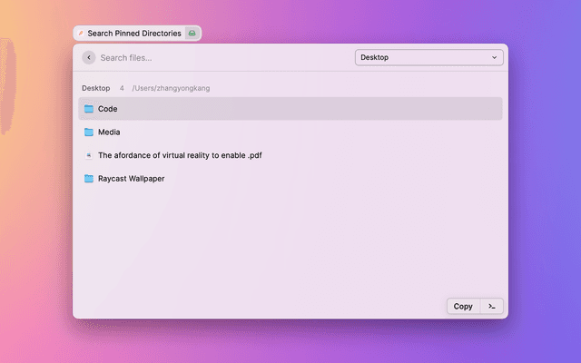 This extension is equivalent to moving a folder to the Dock bar. Previously you had to use the mouse to access the folder in the Dock bar, now you can use Raycast to quickly access the pinned folder.