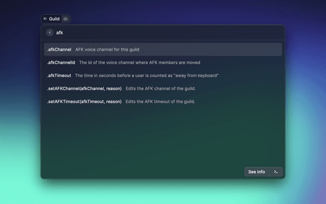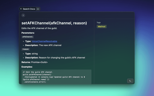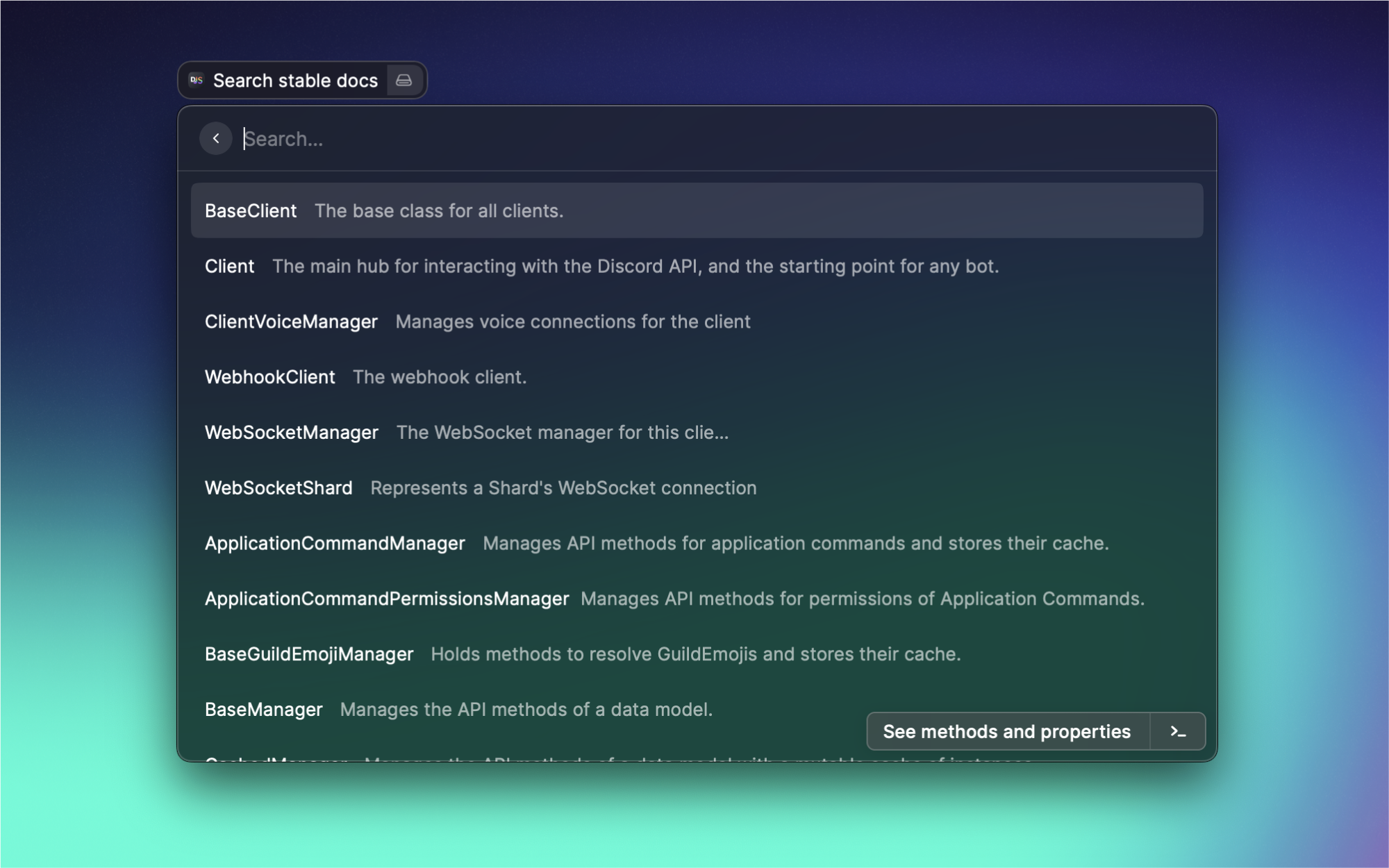 Quickly search through discordjs documentation with fuzzy search.