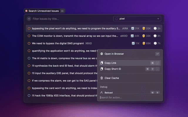 An extension to quickly search unresolved issues in Sentry. This can be handy to stay on top of erros and squash these nasty bugs.