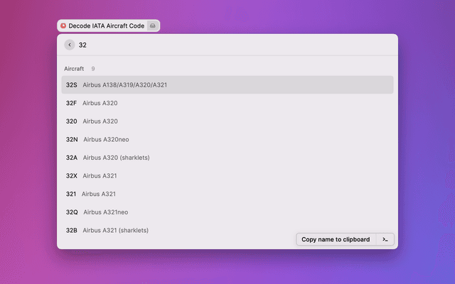 This Raycast extension decodes IATA codes for airports, airlines and aircraft, allowing you to work out what a given code refers to. To do this, it uses a bespoke API.