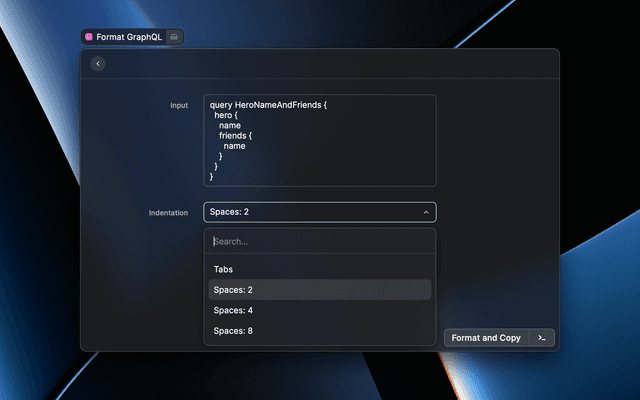 This is a simple extension for Raycast that takes a GraphQL input, formats it according to your indentation preference and copies the resulting formatted GraphQL to the clipboard