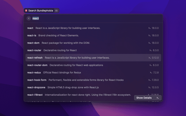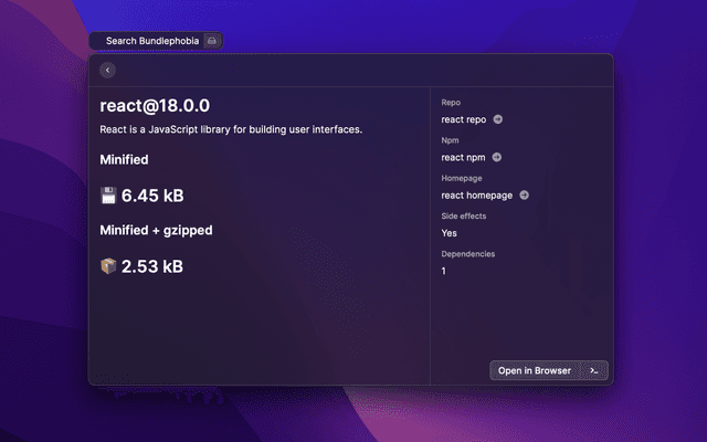 Find package and check its size on bundlephobia